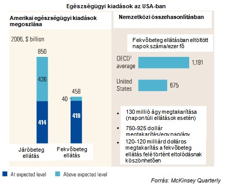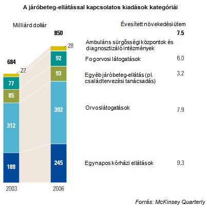 A járóbeteg-ellátás magas igénybevétele tehát az "indokoltnál" (vagyis a McKinsey szakértői által a fejlettséghez igazított kiadási szintnél) nagyobb egészségügyi kiadásokból még a megtakarításokkal (a fentebb említett 100-120 milliárd dollárt figyelembe véve) együtt is 326 milliárd dollárért felelős. A 2006-ban összesen 850 milliárd dollár értékű járóbeteg-ellátás jelentős része a kórházi ellátásból és az orvoslátogatásokból származik (három év leforgása alatt 9.3%-kal, illetve 7.9%-kal növekedett értékük).