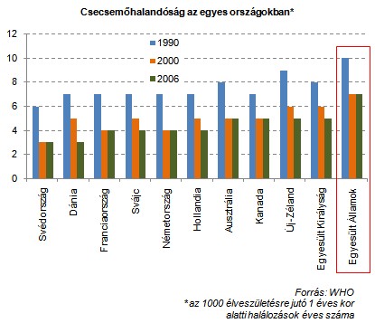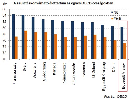 Klikk a képre!A McKinsey szakértői azonban felhívják a figyelmet arra is, hogy az USA még a fejlettek közül is kiemelkedik : számításaik szerint a világ legnagyobb gazdasága megközelítőleg 650 milliárd dollárral többet költ az egészségügyre, mint azt a fejlettsége (illetve gazdagsága) indokolná. A McKinsey tanulmánya felteszi a kérdést: azért áll fent ez a többletkiadás, mert az amerikai polgárok kevésbé egészségesek, mint mások a világban? Szerintük a válasz egyértelműen nem. Viszont az tény, hogy a magas GDP-arányos összegek ellenére Egyesült Államok nem áll túl jó helyen több egészségügyi mutató rangsorában: így sem a születéskor várható élettartam, sem pedig a csecsemőhalandóság területén. Az OECD szakértői hangsúlyozzák, hogy természetesen létezik számos tényező (erőszakból és balesetből származó halálesetek magas kockázata, az elhízottak magasabb aránya), ami magyarázhatja az USA szomorúnak nevezhető teljesítményét, azonban mindezek csak részben felelnek a "lemaradásért". A nagyobb okokat az egészségügyi rendszerben találhatjuk.