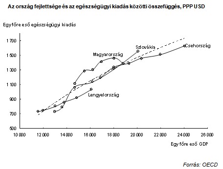 Úgy tűnik, csak nagyon lassan vagyunk hajlandóak szembesülni azzal, hogy Magyarország mostanra szegényebb, mint Csehország és Szlovákia és emiatt nálunk kevesebb jut egészségügyre is. Õk 1.626 (CZ) és 1.555 (SK) dollárt költöttek egy főre vetítve 2007-ben, míg mi csak 1.388 dollárt. Azonban ezeknek az országoknak a GDP-je mostanra magasabb, mint hazánké (CZ: 24.027 és SK: 20.079 per fő 2007-ben, míg HU: 18.799). Az a szomorú helyzet, hogy szegényebb ország vagyunk és emiatt alacsonyabb egészségügyi kiadásokat engedhetünk meg magunknak.