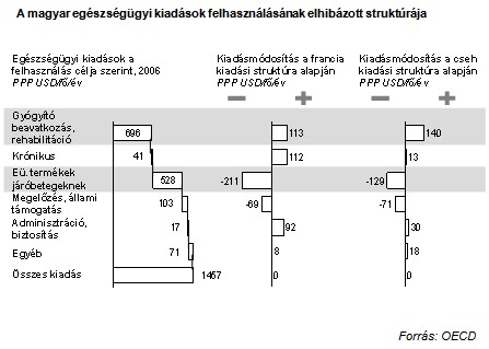 Az ábra bal oldali oszlopában az látható, hogy az OECD szerint milyen tételekből épült fel az egy főre eső egészségügyi kiadás 2006-ban Magyarországon. Az ábra másik két oszlopa pedig azt mutatja, hogy ha nem a 2006-os magyar kiadási szerkezet szerint bontanánk meg a 2006-os magyar kiadásokat, hanem a francia (középső diagram) vagy a cseh (jobb oldali diagram) arányok szerint, akkor az egyes célokra mennyivel kellene többet (+) vagy kevesebbet (-) költenünk.